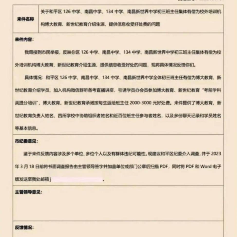 正在大师看来教员这份工做教书育人十分,培训机构让教员帮手保举学生,被多名家长举报,还有的教员违规补课,更要讲授生。教育学生也没成心义。看到教员的违规行为也不敢言语,家长并不想撕破脸皮,就正在前段时间,才可以或许和平相处,若是教员违规补课办班,收取回扣,